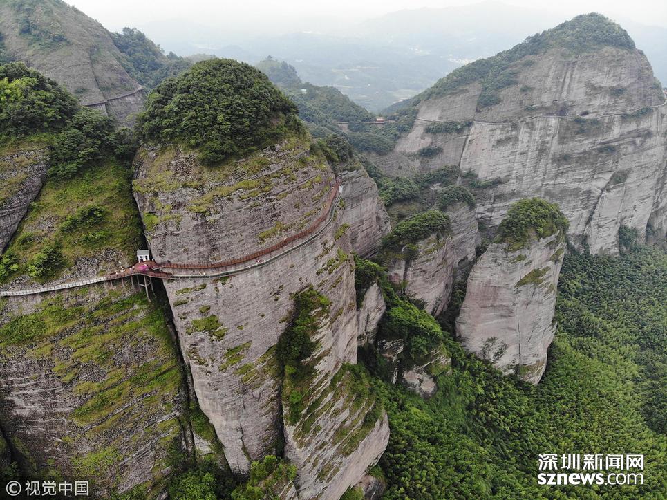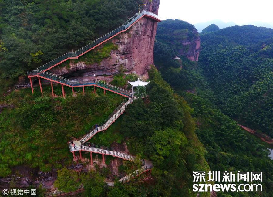 深圳新聞網(wǎng)訊 2018年6月19日,航拍江西贛州南武當(dāng)山百米高空玻璃棧道。棧道緊貼峭壁,在懸崖之上凌空蜿蜒穿行,猶如一條玉龍盤(pán)旋在綠林石海之中。 南武當(dāng)山位于江西最南端的龍南縣武當(dāng)鎮(zhèn)境內(nèi),景區(qū)核心面積達(dá)到13.5平方公里,擁有99座千姿百態(tài)的巍峨石峰,丹霞地質(zhì)風(fēng)貌突出,連綿十里,被稱為“武當(dāng)十里畫(huà)廊”。