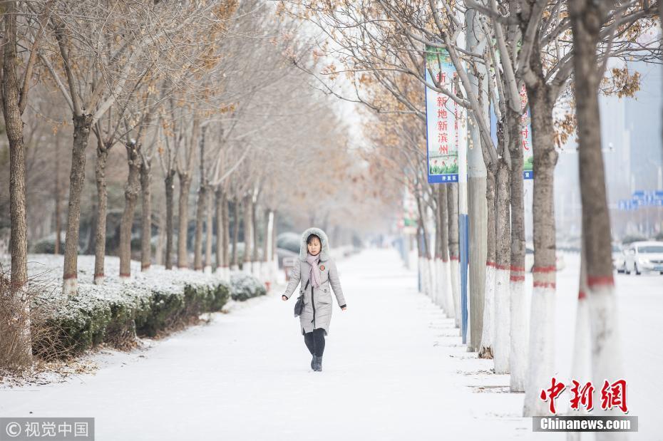 山東濱州發(fā)布道路結(jié)冰黃色預警信號市區(qū)出現(xiàn)較明顯降雪,路表溫度低于0℃。圖片來源:視覺中國