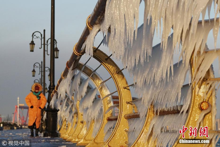渤海海水在北風的作用下涌向岸邊,在大連東港海岸護欄上凝結(jié)成冰凌,形成約有兩公里的冰凌奇觀。圖為大連市東港海岸護欄結(jié)滿晶瑩剔透的冰棱。圖片來源:視覺中國