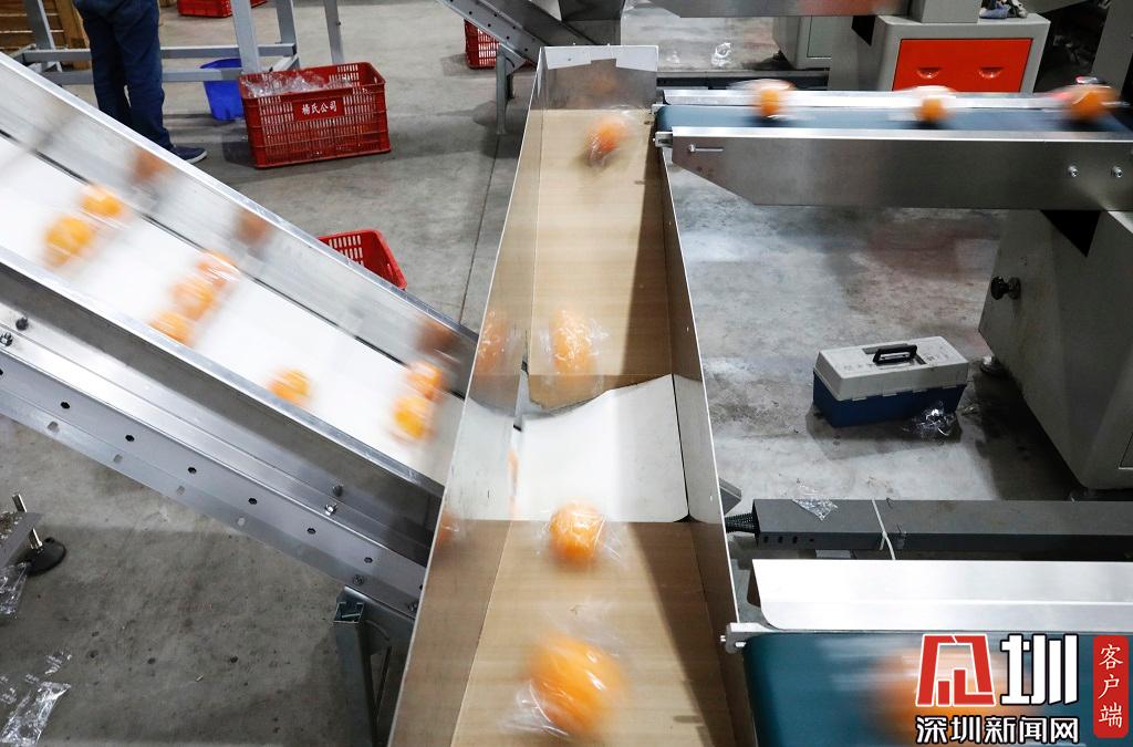 臍橙在機(jī)器管道中滾動(dòng)。