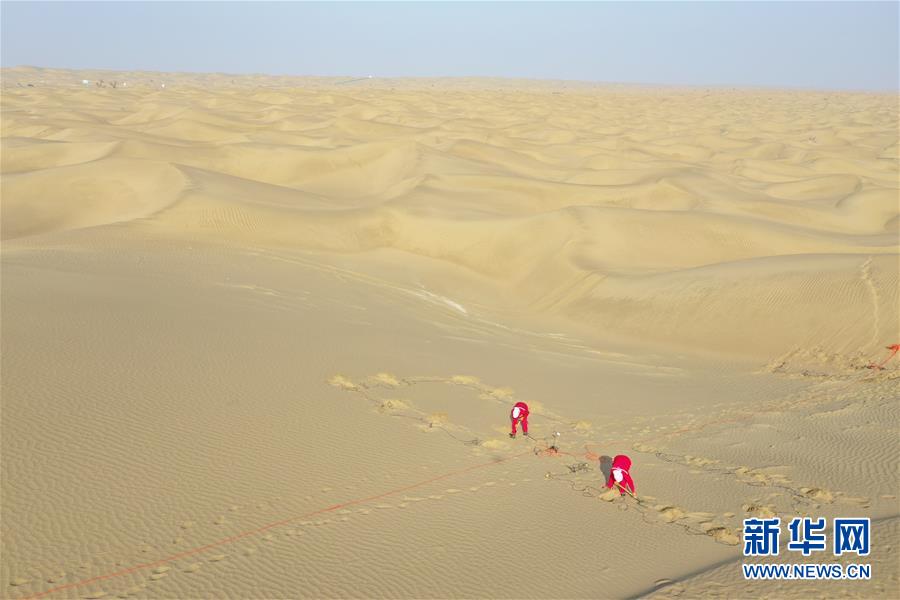 放線女工在塔克拉瑪干沙漠腹地進(jìn)行放線工作(無人機照片,1月14日攝)。