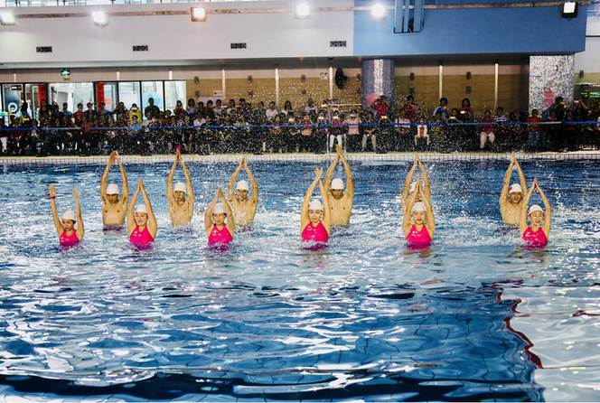 活動伊始,來自廣州體育學院的水中健身操教練團隊為大家?guī)砹司实乃屑w徒手操、水中集體太極、水中集體恰恰、水中集體健身棒操、水中集體深水操表演。接下來的體驗時間,身著泳衣的學員們在專業(yè)教練的指導(dǎo)下進行熱身活動。十分鐘左右的熱身活動結(jié)束后,學員們走下泳池踩著音樂的節(jié)拍于水中體驗水中游戲、健身徒手操、手中太極等課程,學員們在教練的帶動下,熱情的學習跑、跳、拉伸等動作,利用水的阻力、浮力和傳熱性進行全身耗氧運動。
