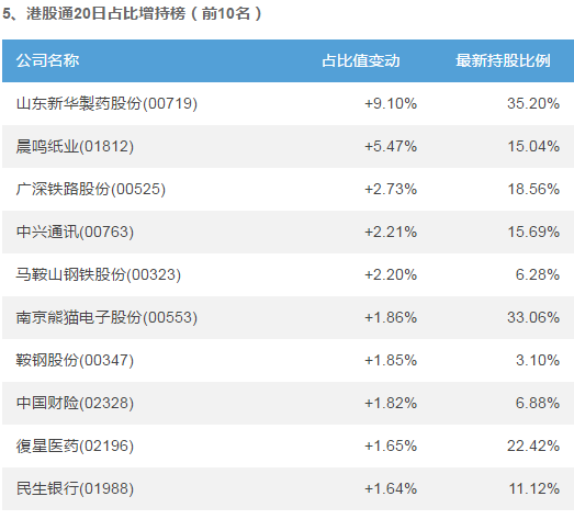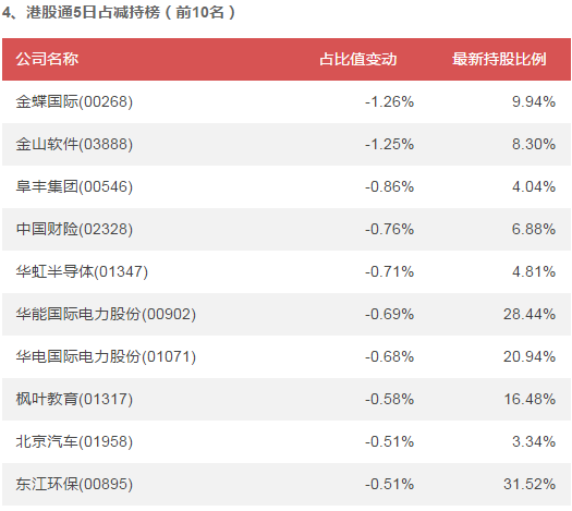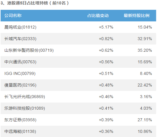 在最近5個交易日內(nèi),晨鳴紙業(yè)(01812)、長城汽車(02333)、山東新華製藥股份(00719)港股通持股占比增加值最大,分別增加5.17%、0.82%、0.62%;金蝶國際(00268)、金山軟件(03888)、阜豐集團(00546)港股通持股占比減少值最大,分別減少-1.26%、-1.25%、-0.86%。