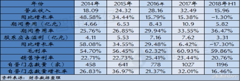 根據(jù)智通財(cái)經(jīng)APP的梳理,周黑鴨自營門店數(shù)量在2014年為458家,此后三年公司自營門店數(shù)量每年都有超過20%的增長,但期間公司營業(yè)收入增幅卻呈現(xiàn)放緩的趨勢。與此同時(shí),公司門店數(shù)量的增長也帶來費(fèi)用率逐年提升,截至2017年,公司期間費(fèi)用率達(dá)到33.55%,以至于公司凈利潤增速同比下滑超過23個(gè)百分點(diǎn)。公司2018年中期財(cái)報(bào)顯示,上半年公司門店數(shù)量凈增長169家,較2017年增長16.46%,門店數(shù)量快速增長的勢頭雖然的已延續(xù),但卻支撐不起公司營收繼續(xù)保持增長,同時(shí)公司期間費(fèi)用率進(jìn)一步提升至36.47%,導(dǎo)致盈利水平大幅下滑。