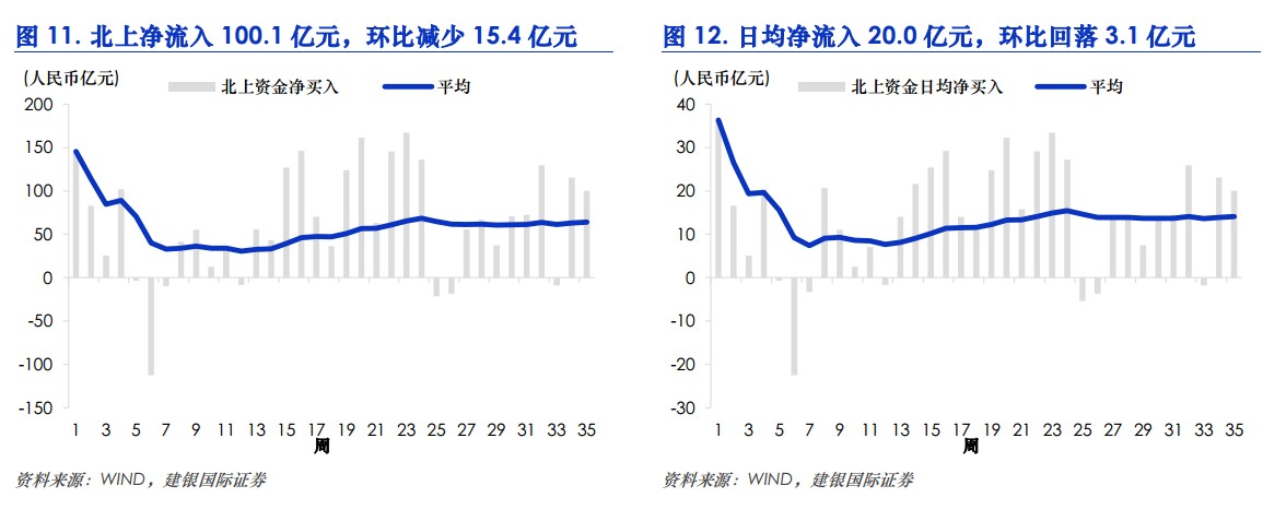 而另一方面,北上資金連續(xù)呈現(xiàn)大幅凈流入,伴隨成交量上升。流入100.1億元人民幣,環(huán)比減少15.4億元,仍明顯好于南下資金。日均凈流入20.0億元,較前期回落 3.1億元。
