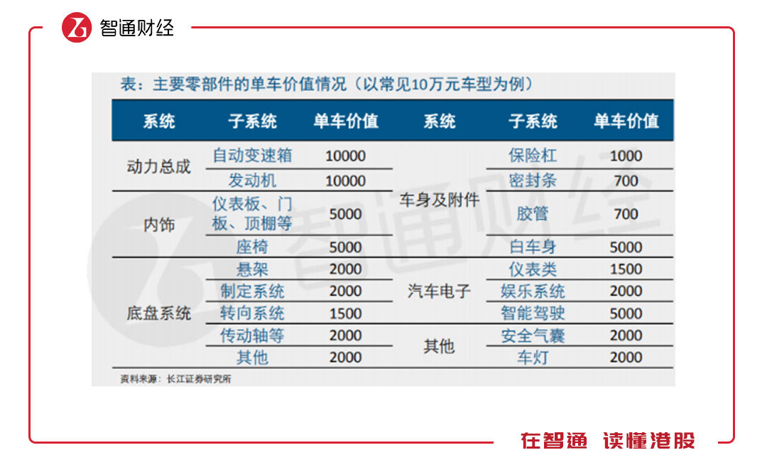 先看燃油車,按照長(zhǎng)江證券的研究,以10萬(wàn)元車型為例,各系統(tǒng)價(jià)值合計(jì)5.58萬(wàn)元,動(dòng)力總成占了35.8%,內(nèi)飾及汽車電子占33%,底盤占17%,車身及附件占13.3%。