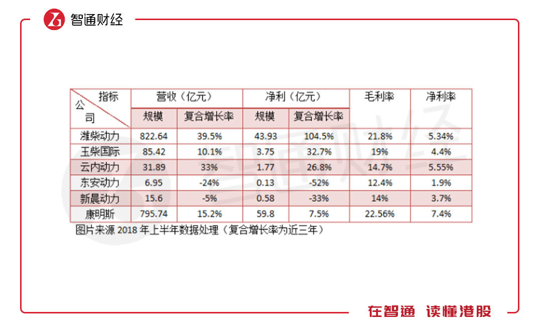 國(guó)內(nèi)的發(fā)動(dòng)機(jī)供應(yīng)市場(chǎng)高度集中,前十大供應(yīng)占據(jù)了超過7成的份額,主要為柴油機(jī)供應(yīng),適用于商用車,龍頭濰柴動(dòng)力(02338)市場(chǎng)份額最大。汽油機(jī)適用于乘用車,由于主要為內(nèi)供,市場(chǎng)數(shù)據(jù)較少。與國(guó)際龍頭康明斯相比,上半年國(guó)內(nèi)的柴油機(jī)企業(yè)賺錢能力還是較低的。