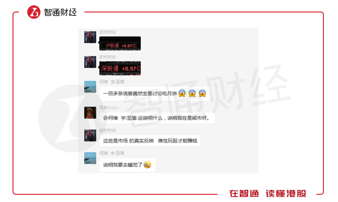被黑天鵝痛擊一番后,市場悲觀情緒明顯占據(jù)了上風。智通財經(jīng)APP觀察到,某500人的投資大群雖活躍度照常,但全變成了說“新財富風月”、“品月餅”,絲毫沒有往日的“談市場、擺數(shù)據(jù)、說動向”,甚至不惜爭個臉紅耳赤的情形。