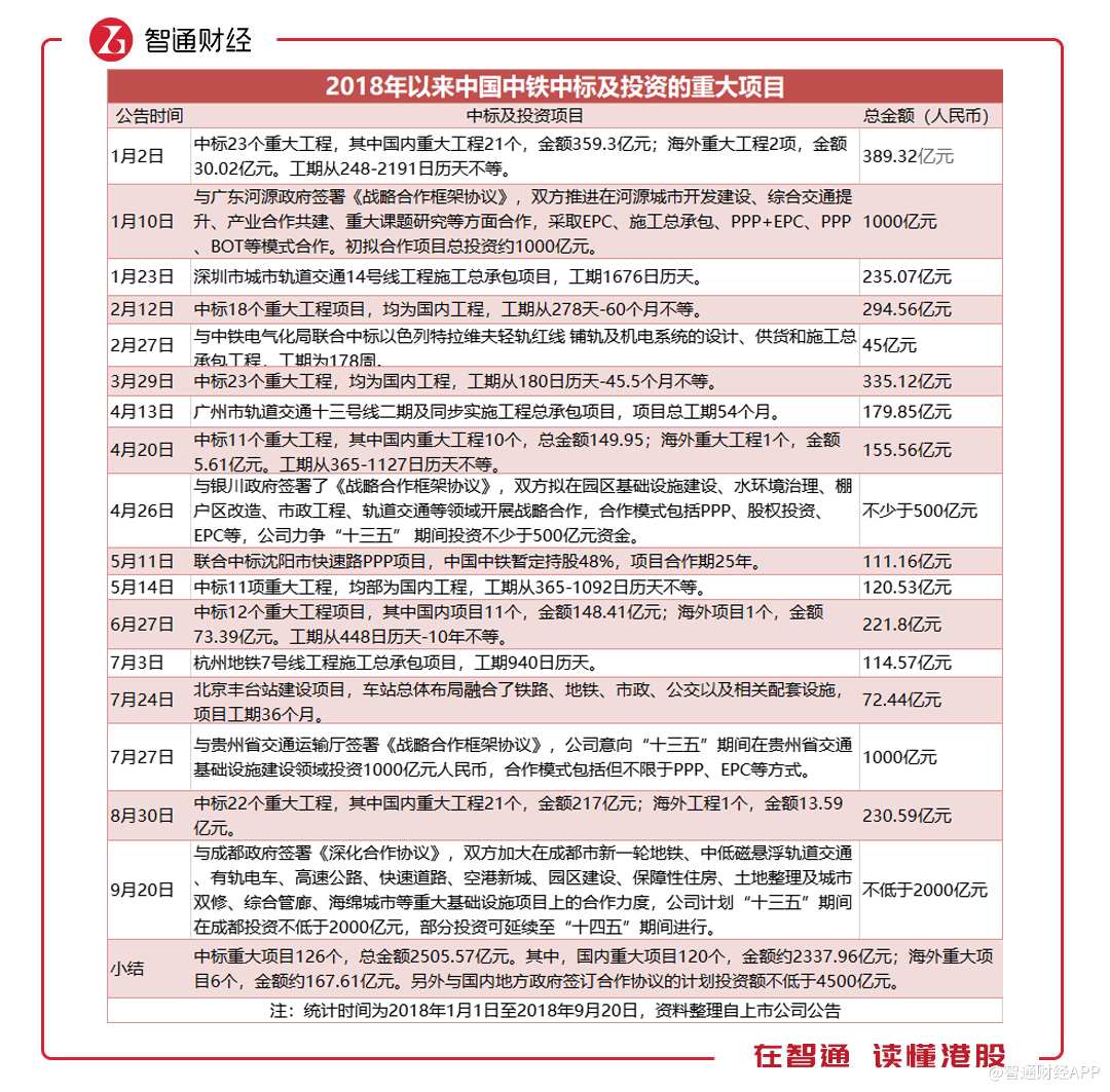 今年年初至9月底,中國中鐵共披露中標(biāo)的重大項目126個,項目總金額2505.57億元,超過去年全年所披露的重大項目金額。而這是在海外重大項目數(shù)量及金額明顯減少的情況下取得的,反映國內(nèi)的基建需求依然強(qiáng)勁。這些中標(biāo)的重大項目對中國中鐵來說也意味著未來可能釋放的巨大收入增長空間。