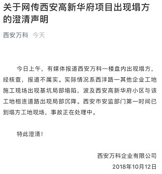 關(guān)于網(wǎng)傳萬科西安高新華府項目出現(xiàn)塌方的澄清聲明如下: