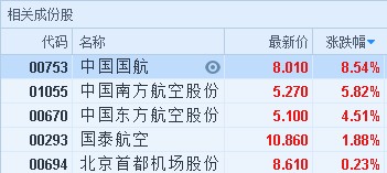 智通財經(jīng)APP獲悉,受益于國際原油價格下挫,航空股全線大漲。截至9時20分,中國國航(00753)漲8.54%,報價8.01港元,南方航空(01055)漲5.82%,報5.27港元,東方航空(00670)漲4.51%,報5.1港元,國泰航空(00293)漲1.88%,首都機場(00694)漲0.23%。