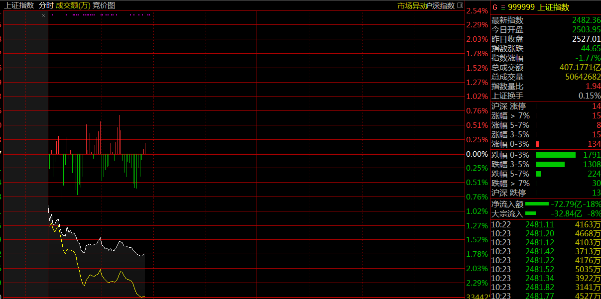 受美股加速下跌影響,12月25日,兩市大幅低開(kāi),滬指開(kāi)盤(pán)報(bào)2503.95點(diǎn),跌0.91%。深成指開(kāi)盤(pán)報(bào)7308.61點(diǎn),跌1.14%。創(chuàng)業(yè)板開(kāi)盤(pán)報(bào)1269.14點(diǎn),跌1.18%。