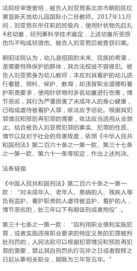 智通財(cái)經(jīng)APP獲悉,12月26日上午,北京市朝陽(yáng)區(qū)人民法院依法對(duì)被告人劉亞男(紅黃藍(lán)幼兒園教師)虐待被看護(hù)人案公開(kāi)宣判,以虐待被看護(hù)人罪一審判處劉亞男有期徒刑一年六個(gè)月,同時(shí)禁止其自刑罰執(zhí)行完畢之日或者假釋之日起五年內(nèi)從事未成年人看護(hù)教育工作。(肖順蘭)