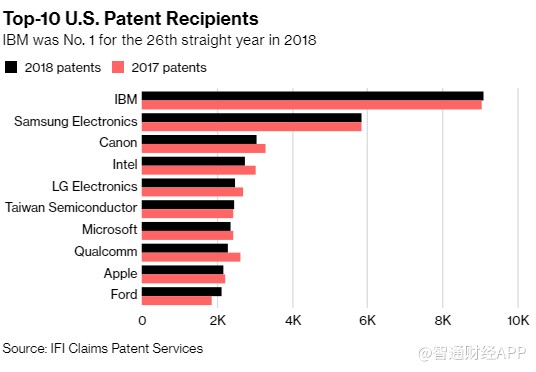 根據(jù)Fairview Research旗下IFI Claims Patent Services的分析,僅IBM一家公司就獲得了9100項(xiàng)專利,保住了其第一名的位置,并將IBM的連勝時(shí)間延長(zhǎng)到了26年。