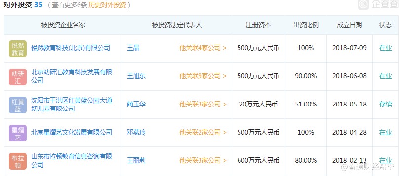 不過,在內(nèi)地業(yè)務(wù)上,該公司今后的發(fā)展方向或也會出現(xiàn)一些變化,教育衍生品或?qū)⑹窃摴就顿Y方向,以該公司2018年投資的標(biāo)的來說,根據(jù)企查查的數(shù)據(jù),該公司投資成立的大部分是教育相關(guān)的服務(wù)。以下為企查查搜到的紅黃藍(lán)2018年投資成立的項(xiàng)目: