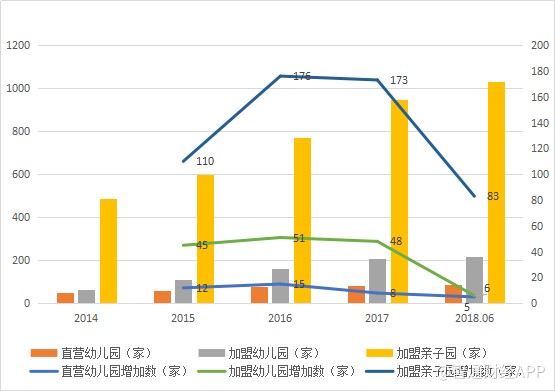2018年上半年,紅黃藍(lán)共有90家直營幼兒園,216家加盟幼兒園以及1029家加盟親子園,加盟一直是該公司擴(kuò)張發(fā)展的主力,但2018年突然剎車,上半年加盟幼兒園增加僅6家,而加盟親子園也折戟超過了一半。
