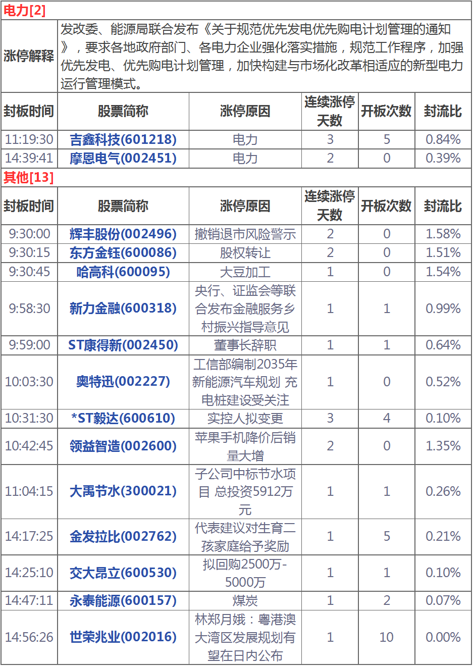 今天漲停家數(shù)較上一交易日有所減少,兩市75家漲停,跌停1家。成交量方面,滬市成交1567億元,深市成交2085億元,兩市總成交額約為3652元,較上一交易日放量453億元。盤(pán)面上板塊普漲,OLED、醫(yī)藥、天津自貿(mào)區(qū)、氟化工等板塊漲幅居前。