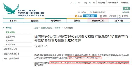 香港證監(jiān)會(huì)調(diào)查發(fā)現(xiàn),國(guó)信證券在2014年11月至2015年12月期間曾為超過(guò)3500名客戶處理10000筆涉及總額約50億港元的第三者存款。監(jiān)管特別指出,國(guó)信于為期14個(gè)月的期間,處理了超過(guò)2200筆可疑的第三者存款,涉及總額超過(guò)23億港元。