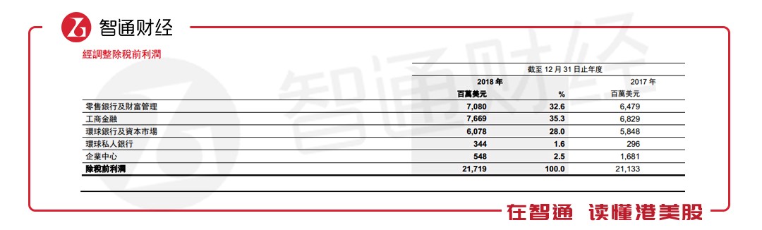 其中,由于利率上升、客戶增加以及英國和香港按揭業(yè)務(wù)實(shí)現(xiàn)逾200億美元增幅,帶動(dòng)零售銀行及財(cái)富管理業(yè)務(wù)出現(xiàn)9.28%幅度的增長。然而,受四季度市場波動(dòng)影響,財(cái)富管理業(yè)務(wù)經(jīng)調(diào)整收入較前三季度有輕微下降。