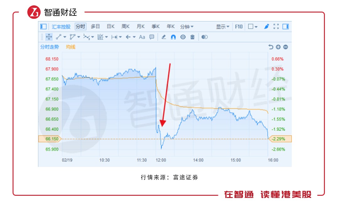 自午間業(yè)績公布后,匯控股價(jià)出現(xiàn)斷崖式下跌,雖隨后有所回升,但整體依舊無力回天,最終以66.15港元收尾,跌幅2.29%。