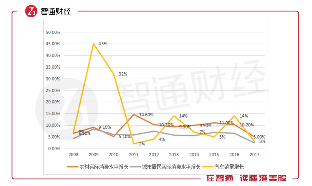 以上數(shù)據(jù)說明,農(nóng)村市場并不樂觀,一方面是實際的購買力弱,遠(yuǎn)低于2007年的城市消費水平,一方面農(nóng)村及城市消費水平增長均下滑,若經(jīng)濟增長壓力持續(xù)存在,未來可能錄得負(fù)增長,汽車銷量將難以反彈。
