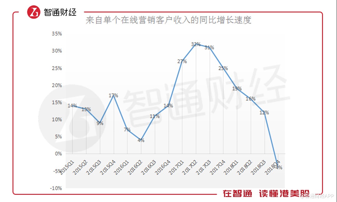 在連續(xù)下滑5個季度后,至2018年第四季度時,單個在線營銷客戶收入同比下滑4%,是2015年以來的首次負增長。而四季度在線廣告收入同比增長10%主要是因為在線營銷客戶數(shù)量的增加。財報中表示,第四季度時,公司的在線營銷客戶為52.9萬名,同比增長15%。