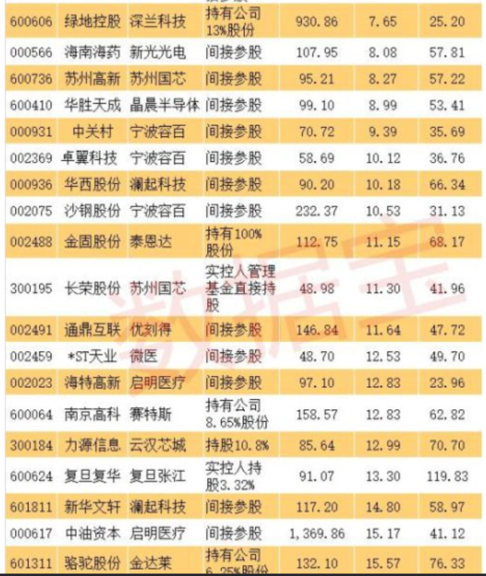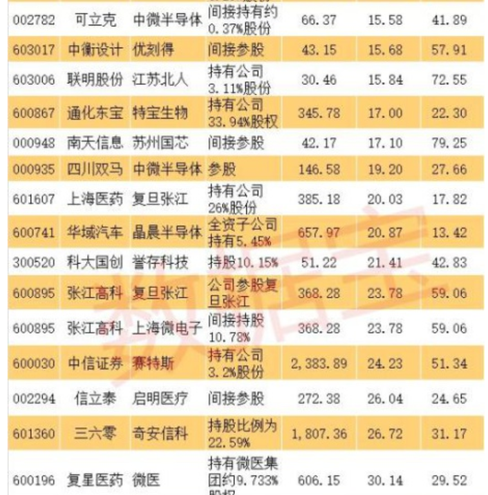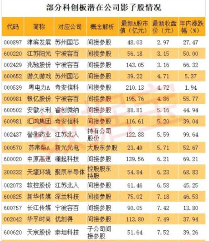 科創(chuàng)板影子股:首批創(chuàng)業(yè)板潛在公司背后有超過50只影子股,而這些影子股大多是間接持股。從持股比例來看,最大的是金固股份,持有泰恩達(dá)100%股權(quán)。其他影子股持股比例較大的還有,通化東寶持有33.94%特寶生物、上海醫(yī)藥持有26%復(fù)旦張江、三六零持有22.59%奇安信科、張江高科間接持有10.78%上海微電子、綠地控股持有13%深蘭科技、力源信息持有10.8%云漢芯城、科大國(guó)創(chuàng)持有10.15%譽(yù)存科技、南京高科持有8.65%賽特斯、駱駝股份持有6.25%金達(dá)萊等。