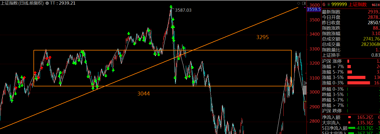 再看5分鐘級(jí)別走勢(shì)結(jié)構(gòu),在特朗普的幫助下,這里直接跌穿了三月份構(gòu)建的三十分鐘級(jí)別中樞,力度較大。周五逆轉(zhuǎn)趨勢(shì)后,在三十分鐘中樞下面,完成了這段下跌趨勢(shì)第二個(gè)五分鐘中樞的構(gòu)建工作。大概率宣告了這段五分鐘下跌趨勢(shì)的終結(jié)。下周一、周二,上證指數(shù)面臨了上方30分鐘中樞下軌2968點(diǎn)的反壓,可能會(huì)出現(xiàn)回落,投資者可逢低吸納。