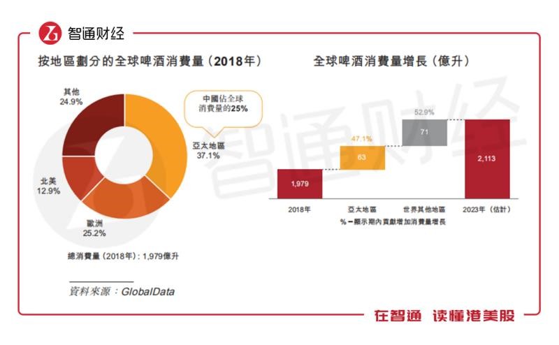 從行業(yè)角度來看,根據GlobalData的數(shù)據,截至2018年,按消費量及價值計算,亞太地區(qū)是全球最大啤酒消費市場,也是全球啤酒銷量增速最快的地區(qū)之一。2018年亞太占全球啤酒銷量的37%,且預計2018年至2023年將貢獻全球啤酒銷量增幅的47%。