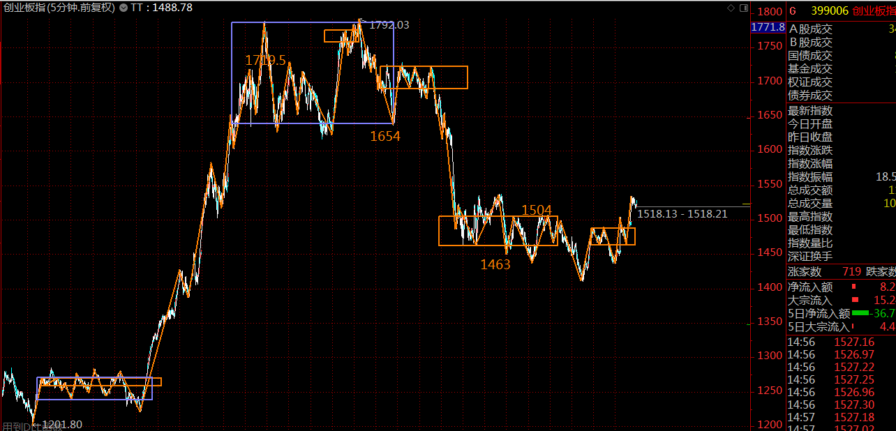 創(chuàng)業(yè)板空間可能相對(duì)較大,壓力位在1654點(diǎn)附近,這里同樣是處在五分鐘上漲趨勢(shì)中,耐心持股待漲,直至出現(xiàn)五分鐘趨勢(shì)背馳為止。