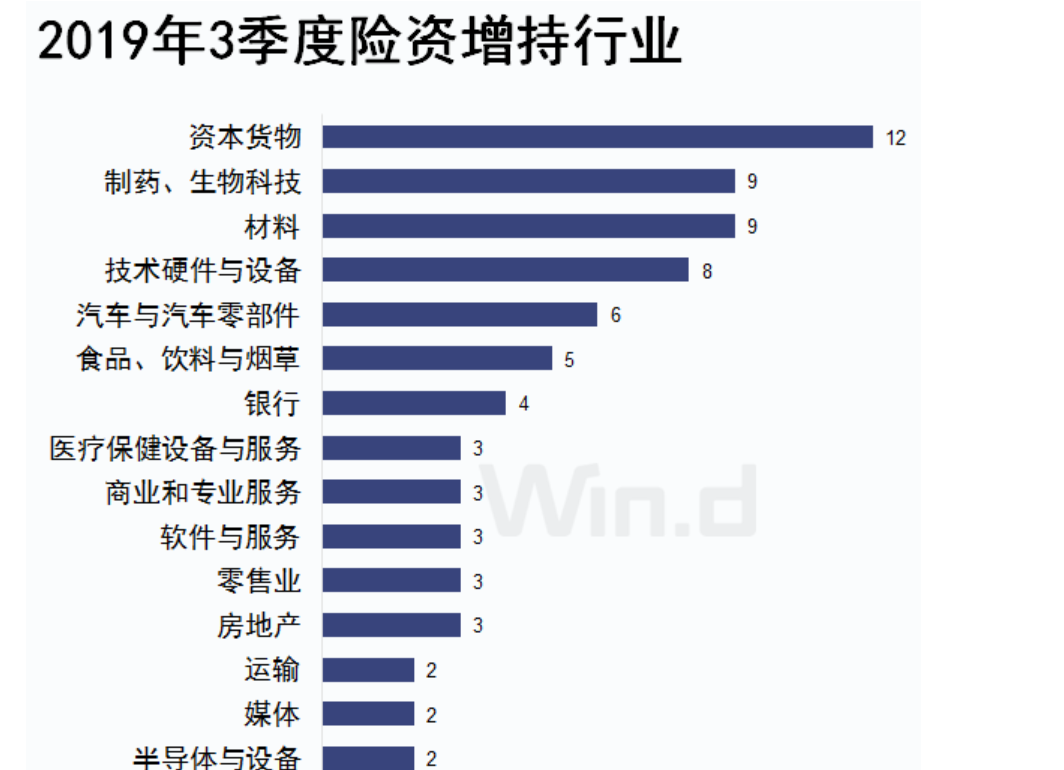 險(xiǎn)資財(cái)大氣粗,其一舉一動(dòng)受到資本市場(chǎng)密切關(guān)注:據(jù)Wind數(shù)據(jù)統(tǒng)計(jì),截止2019年3季度末,兩市共有376家上市公司被險(xiǎn)資持有,持有股數(shù)約為833.21億股;132只保險(xiǎn)產(chǎn)品共持有約12380億元市值A(chǔ)股股票。資本貨物、醫(yī)藥、軟硬件、食品等獲重點(diǎn)增持。