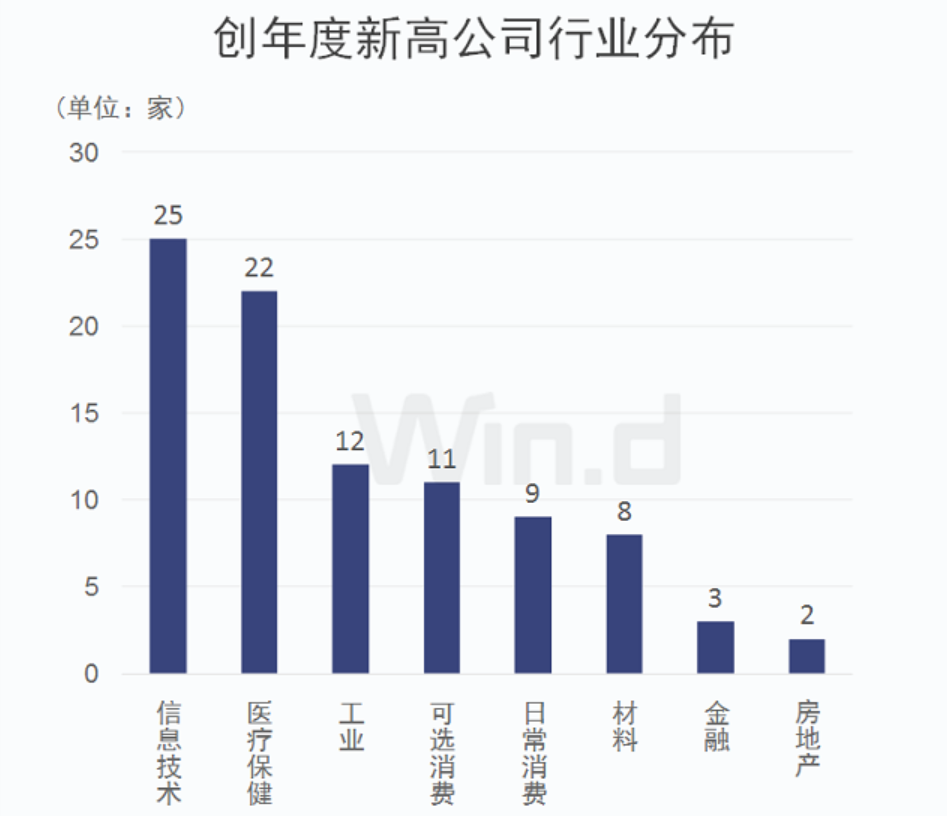 Wind統(tǒng)計顯示,有92家公司近3日最高股價創(chuàng)今年以來新高。從相關(guān)公司行業(yè)分布來看,信息技術(shù)類最多,有25家;醫(yī)療保健行業(yè)緊隨其后,有22家,工業(yè)、可選消費(fèi)均有超過10家公司??梢?,科技和生物醫(yī)藥類公司成為牛股聚集地。