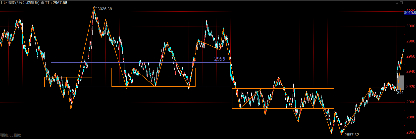 上周市場用前四天的時間,完成了這一輪五分鐘上漲趨勢的第一個中樞構(gòu)建,是一個奔走型的中樞,隨后在周五開始了主升階段。值得欣喜的是,市場終于在2956這個大關(guān)口放量了,并且一舉突破,預(yù)計在2956到3000點這40點的空間內(nèi),市場將會完成五分鐘上漲第二個中樞的構(gòu)建,并且橫盤將其擴(kuò)展為30分鐘級別,時間周期大約是極點出現(xiàn)后的10到15個交易日。這將是投資者積極調(diào)倉換股,耐心布局年報行情的最佳時期。