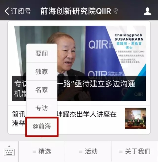 在“前海創(chuàng)新研究院QIIR”的底部菜單欄里找到“@前?!?,就可進(jìn)入以下頁(yè)面,從研究院放眼前海,獲得一手新鮮資訊。