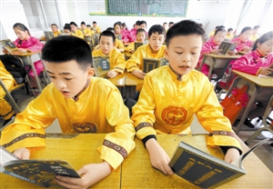“父母呼,應勿緩,父母命,行勿懶……”新學期開學后,每天上午上課前十分鐘,寶龍學校2000多名學生,都會拿出學校特制的講義,齊聲誦讀《弟子規(guī)》。這是該校為培養(yǎng)學生養(yǎng)成良好的行為習慣、弘揚祖國優(yōu)秀傳統(tǒng)文化而推出的“國學經(jīng)典進課堂”計劃的一部分。