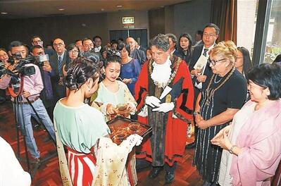 ▲劍橋市長(zhǎng)杰芮米·本斯特德及夫人接受唐式茶禮。