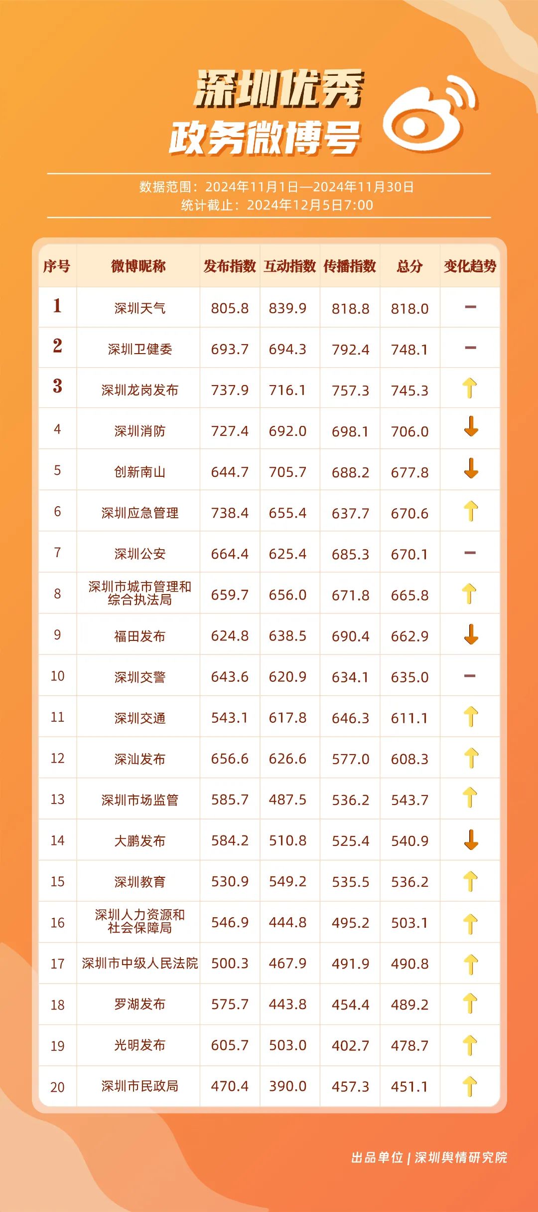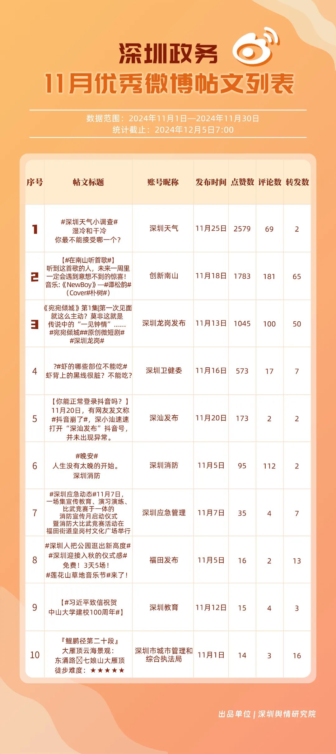 11月,“深圳天氣”“深圳衛(wèi)健委”“深圳龍崗發(fā)布”“深圳消防”“創(chuàng)新南山”“深圳應(yīng)急管理”“深圳公安”“深圳市城市管理和綜合執(zhí)法局”“福田發(fā)布”“深圳交警”等20個賬號入選“優(yōu)秀政務(wù)微博號”。“深圳天氣”“深圳衛(wèi)健委”賬號在信息傳播上不斷精進(jìn),為市民帶來及時、優(yōu)質(zhì)且高效的資訊,內(nèi)容緊貼民生,贏得了市民的廣泛贊譽(yù),排名穩(wěn)定在前2名。同時,“深圳龍崗發(fā)布”“深圳消防”和“創(chuàng)新南山”等賬號也能夠精準(zhǔn)滿足市民的信息需求,并在此基礎(chǔ)上提升市民閱讀體驗(yàn),推動了其在榜單上的穩(wěn)步提升,彰顯了政務(wù)微博的創(chuàng)新活力與社會價值。