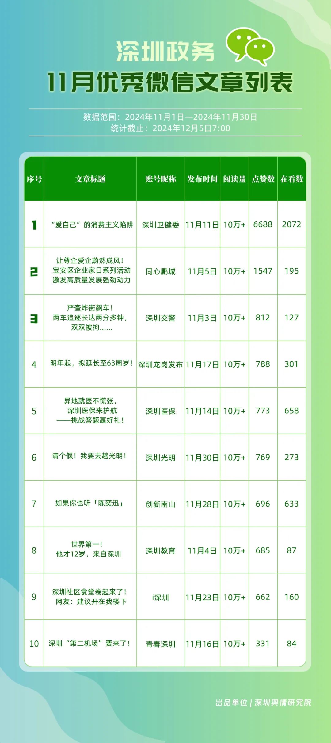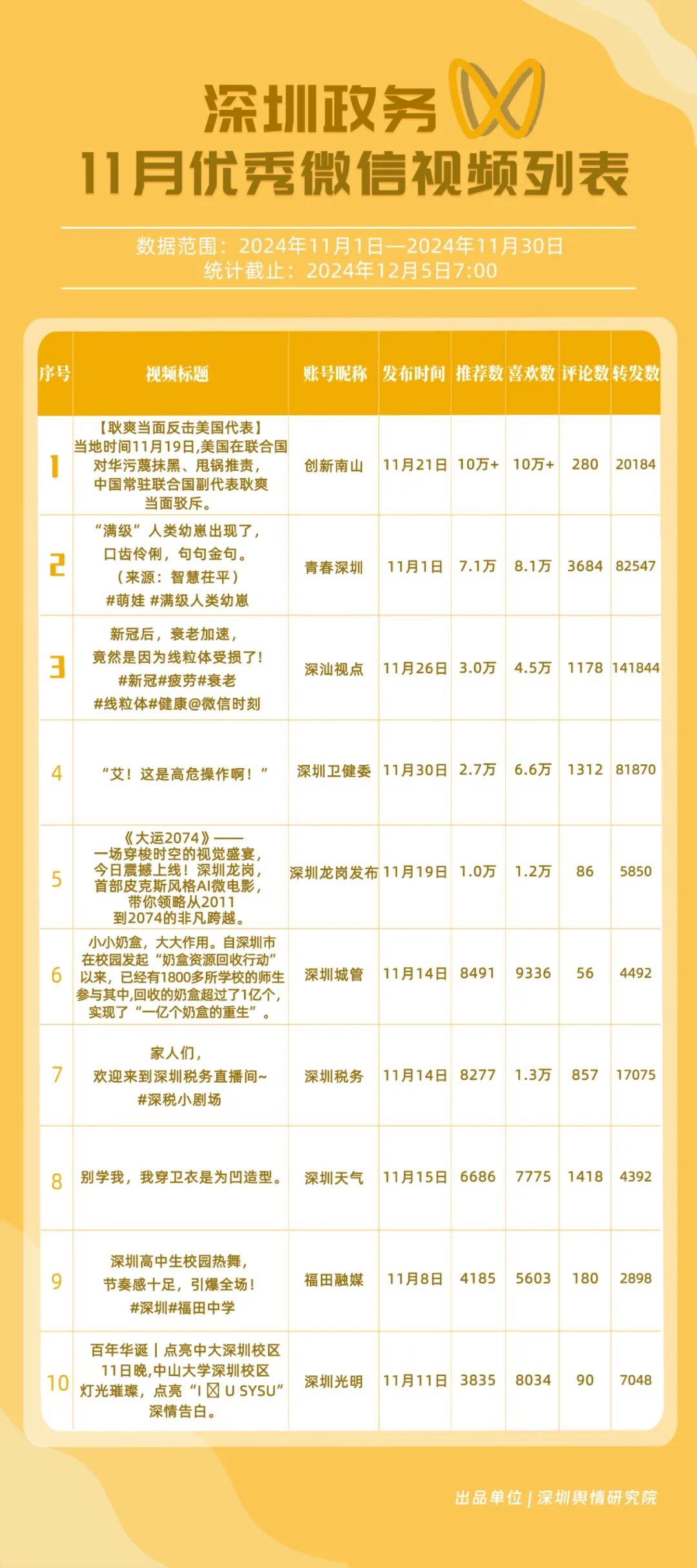 11月,獲“深圳優(yōu)秀政務(wù)微信視頻號”稱號的分別是“深汕視點(diǎn)”“青春深圳”“深圳衛(wèi)健委”“創(chuàng)新南山”“深圳龍崗發(fā)布”“福田融媒”“深圳教育”“深圳天氣”“深圳稅務(wù)”“深圳光明”。其中,“深汕視點(diǎn)”與“青春深圳”通過積極轉(zhuǎn)發(fā)涵蓋廣泛領(lǐng)域的優(yōu)質(zhì)視頻內(nèi)容,贏得了網(wǎng)民的廣泛點(diǎn)贊與推薦,彰顯了其在內(nèi)容聚合與傳播上的獨(dú)到之處。“深圳衛(wèi)健委”則專注于衛(wèi)生健康領(lǐng)域,發(fā)布了一系列高質(zhì)量的內(nèi)容,深受網(wǎng)民喜愛,進(jìn)一步鞏固了其在健康傳播領(lǐng)域的領(lǐng)先地位。