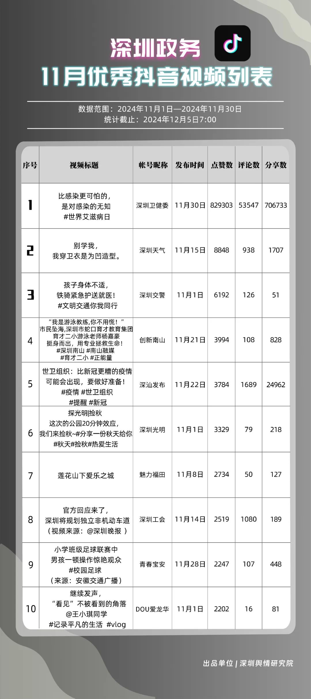 11月,“深圳衛(wèi)健委”“掌上龍崗”“深圳天氣”“深汕發(fā)布”“深圳工會”“深圳交警”“創(chuàng)新南山”“DOU愛龍華”“深圳光明”“中國前?!惫?0個政務(wù)抖音號獲得“深圳優(yōu)秀政務(wù)抖音號”稱號?!吧钲谛l(wèi)健委”憑借高質(zhì)量劇情內(nèi)容,巧妙融入健康知識,視頻累計收獲近百萬點(diǎn)贊。同時,“掌上龍崗”和“深圳天氣”也在視頻內(nèi)容創(chuàng)新上不斷探索,通過優(yōu)化宣傳策略和信息傳播方式,使得網(wǎng)民能夠在輕松愉快的氛圍中了解龍崗區(qū)的最新動態(tài)和深圳的天氣信息,展現(xiàn)了政務(wù)抖音號的獨(dú)特魅力與社會影響力。