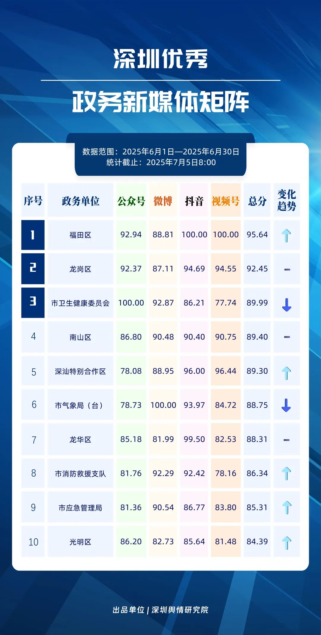 6月,深圳政務(wù)新媒體矩陣各展所長(zhǎng),為市民帶來(lái)豐富實(shí)用的信息服務(wù)。福田區(qū)、龍崗區(qū)、市衛(wèi)生健康委、南山區(qū)、深汕特別合作區(qū)、市氣象局、龍華區(qū)、市消防救援支隊(duì)、市應(yīng)急管理局、光明區(qū)新媒體矩陣入選“深圳優(yōu)秀政務(wù)新媒體矩陣”榜單。值得關(guān)注的是,福田區(qū)新媒體矩陣6月持續(xù)發(fā)力,憑借在抖音、微信視頻號(hào)平臺(tái)的優(yōu)異表現(xiàn)實(shí)現(xiàn)領(lǐng)跑;龍崗區(qū)新媒體矩陣以均衡發(fā)展穩(wěn)居第二;市衛(wèi)生健康委新媒體矩陣在微信公眾號(hào)、微博兩平臺(tái)收獲較高關(guān)注度,位列第三。此外,與5月相比,深汕特別合作區(qū)、市消防救援支隊(duì)、市應(yīng)急管理局、光明區(qū)排名有所上升。