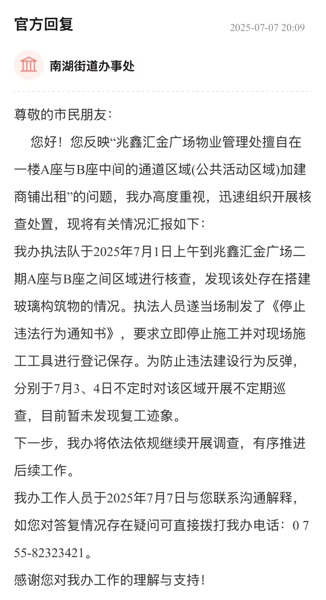 從市民反饋到執(zhí)法處置,羅湖區(qū)南湖街道辦事處以快速響應(yīng)、精準(zhǔn)執(zhí)法展現(xiàn)治理效能。通過(guò)現(xiàn)場(chǎng)核查、制發(fā)《停止違法行為通知書》、登記保存施工工具等措施,及時(shí)遏制違法搭建勢(shì)頭,并建立不定期巡查機(jī)制防止反彈。從“即時(shí)制止”到“長(zhǎng)效監(jiān)督”的閉環(huán)管理,維護(hù)了業(yè)主合法權(quán)益與消防通道安全,為城市違建治理提供了高效務(wù)實(shí)的實(shí)踐樣本,彰顯基層執(zhí)法部門守護(hù)民生安全的責(zé)任擔(dān)當(dāng)。
