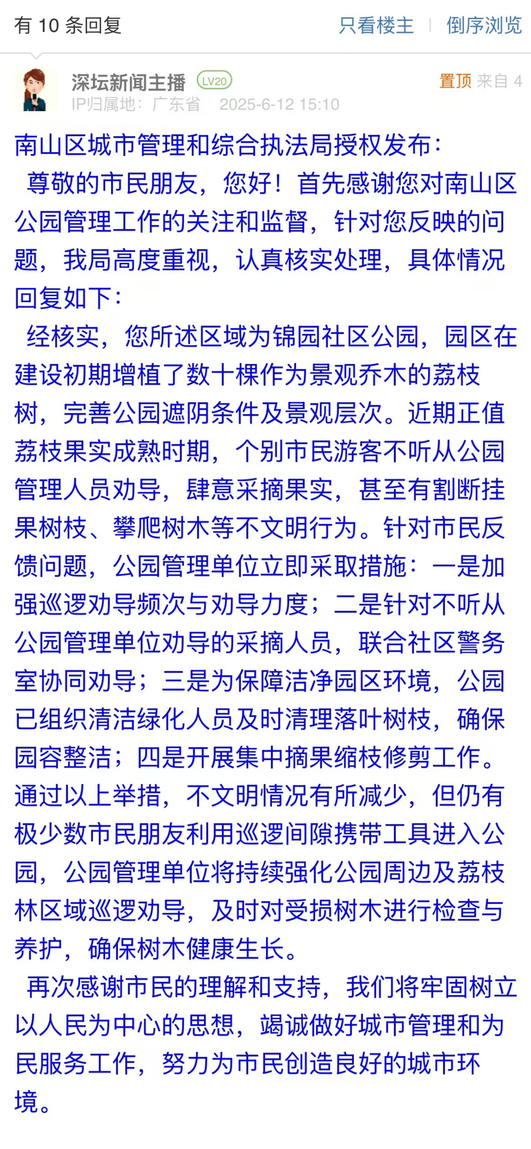 有市民反映南山區(qū)部分公園內(nèi)的荔枝樹被隨意采摘