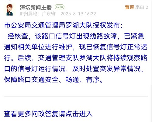 經核查,該路口信號燈出現(xiàn)線路故障,已緊急通知相關單位進行維護,現(xiàn)已恢復信號燈正常運行。后續(xù),交通管理支隊羅湖大隊將持續(xù)觀察路口的信號燈運行情況,及時處置突發(fā)異常情況,保障路口交通安全、暢通、有序。