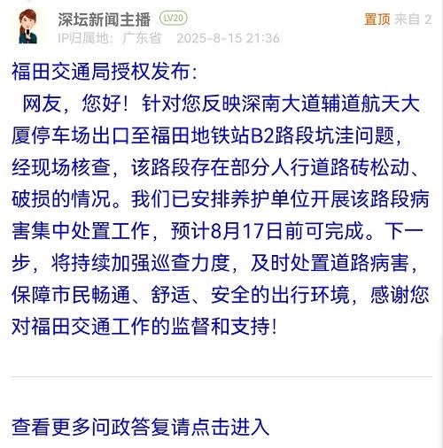 網友,您好!針對您反映深南大道輔道航天大廈停車場出口至福田地鐵站B2路段坑洼問題,經現(xiàn)場核查,該路段存在部分人行道路磚松動、破損的情況。我們已安排養(yǎng)護單位開展該路段病害集中處置工作,預計8月17日前可完成。下一步,將持續(xù)加強巡查力度,及時處置道路病害,保障市民暢通、舒適、安全的出行環(huán)境,感謝您對福田交通工作的監(jiān)督和支持!