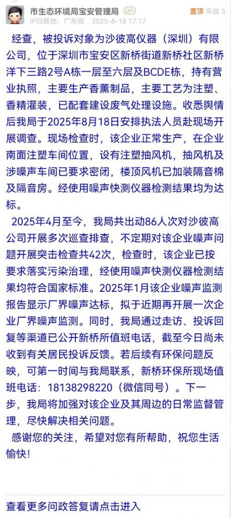 經查,被投訴對象為沙彼高儀器(深圳)有限公司,位于深圳市寶安區(qū)新橋街道新橋社區(qū)新橋洋下三路2號A棟一層至六層及BCDE棟,持有營業(yè)執(zhí)照,主要生產香薰制品,主要工藝為注塑、香精灌裝,已配套建設廢氣處理設施。收悉輿情后我局于2025年8月18日安排執(zhí)法人員赴現(xiàn)場開展調查?,F(xiàn)場檢查時,該企業(yè)正常生產,在企業(yè)南面注塑車間位置,設有注塑抽風機,抽風機及涉噪聲車間已要求密閉,樓頂風機已加裝隔音棉及隔音房。經使用噪聲快測儀器檢測結果均為達標。