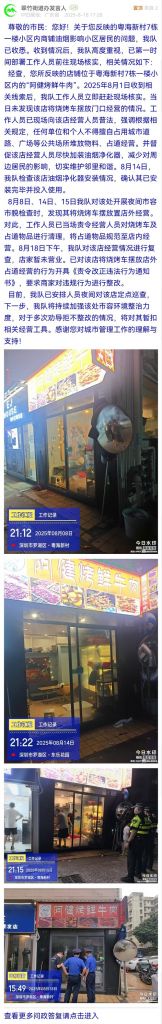 經查,您所反映的店鋪位于粵海新村7棟一樓小區(qū)內的“阿健烤鮮牛肉”。2025年8月1日收到相關線索后,我隊工作人員立即趕赴現(xiàn)場核實。當日未發(fā)現(xiàn)該店將燒烤車擺放門口經營的情況。工作人員已現(xiàn)場向該店經營人員普法,強調根據(jù)相關規(guī)定,任何單位和個人不得擅自占用城市道路、廣場等公共場所堆放物料、占道經營。并督促該店經營人員盡快加裝油煙凈化器,減少對周邊居民的影響,切實維護鄰里和諧。8月14日,我隊檢查該店油煙凈化器安裝情況,確認其已安裝完畢并投入使用。