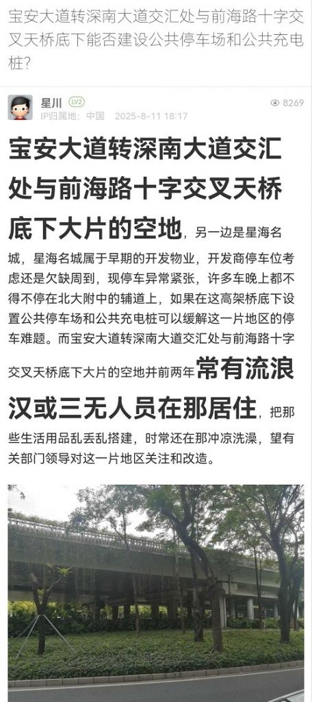 2. 帖文《寶安大道轉深南大道交匯處與前海路十字交叉天橋底下能否建設公共停車場和公共充電樁?》