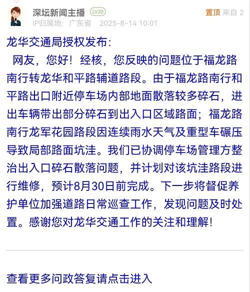 網友,您好!經核,您反映的問題位于福龍路南行轉龍華和平路輔道路段。由于福龍路南行和平路出口附近停車場內部地面散落較多碎石,進出車輛帶出部分碎石到出入口區(qū)域路面;福龍路南行龍軍花園路段因連續(xù)雨水天氣及重型車碾壓導致局部路面坑洼。我們已協(xié)調停車場管理方整治出入口碎石散落問題,并計劃對該坑洼路段進行維修,預計8月30日前完成。下一步將督促養(yǎng)護單位加強道路日常巡查工作,發(fā)現(xiàn)問題及時處置。感謝您對龍華交通工作的關注和理解!