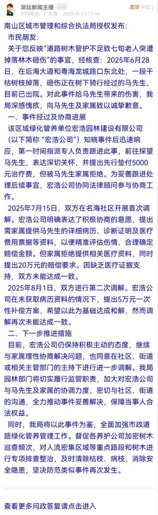 關于您反映“道路樹木管護不足致七旬老人突遭掉落林木砸傷”的事宜,經核查:2025年6月28日,在后海大道和粵海龍城路口東北處,一段干枯樹枝掉落,砸傷正在樹下騎行經過的馬先生,目前已出院。對此事件給馬先生帶來的傷害,我局深感愧疚,向馬先生及家屬致以誠摯歉意。