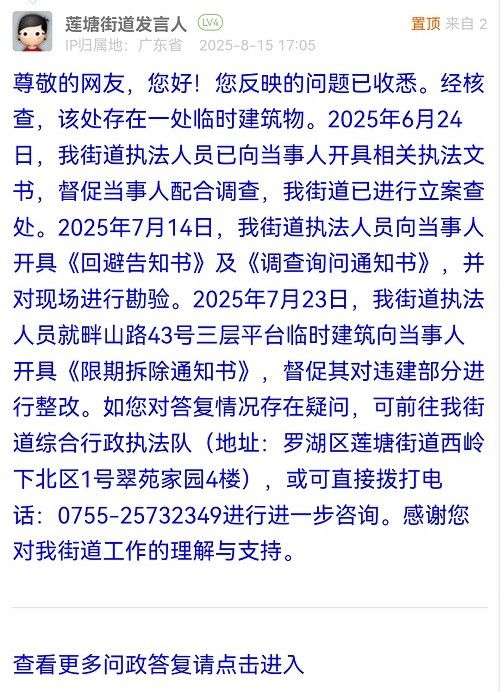 尊敬的網友,您好!您反映的問題已收悉。經核查,該處存在一處臨時建筑物。2025年6月24日,我街道執(zhí)法人員已向當事人開具相關執(zhí)法文書,督促當事人配合調查,我街道已進行立案查處。2025年7月14日,我街道執(zhí)法人員向當事人開具《回避告知書》及《調查詢問通知書》,并對現(xiàn)場進行勘驗。2025年7月23日,我街道執(zhí)法人員就畔山路43號三層平臺臨時建筑向當事人開具《限期拆除通知書》,督促其對違建部分進行整改。如您對答復情況存在疑問,可前往我街道綜合行政執(zhí)法隊(地址:羅湖區(qū)蓮塘街道西嶺下北區(qū)1號翠苑家園4樓),或可直接撥打電話:0755-25732349進行進一步咨詢。感謝您對我街道工作的理解與支持。